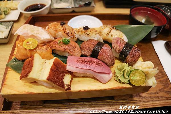 「極上炙燒握壽司」包括炙燒choice等級無骨牛小排嚐起來油脂豐厚咀嚼起來有迷人的松露香氣,法國進口鵝肝醬及赤貝、干貝上面還有珍貴的魚子醬,吃起來都很鮮甜,、海鱺油脂豐富 ,比目魚鰭邊肉吃起來入口即化、鴨胸肉吃起來肉質鮮嫩搭上醋飯吃起來極為美味,、花枝有微微炙燒過口感吃起來很清香, 厚燒玉子燒口感鬆綿, 每一種口味都非常到味好吃~