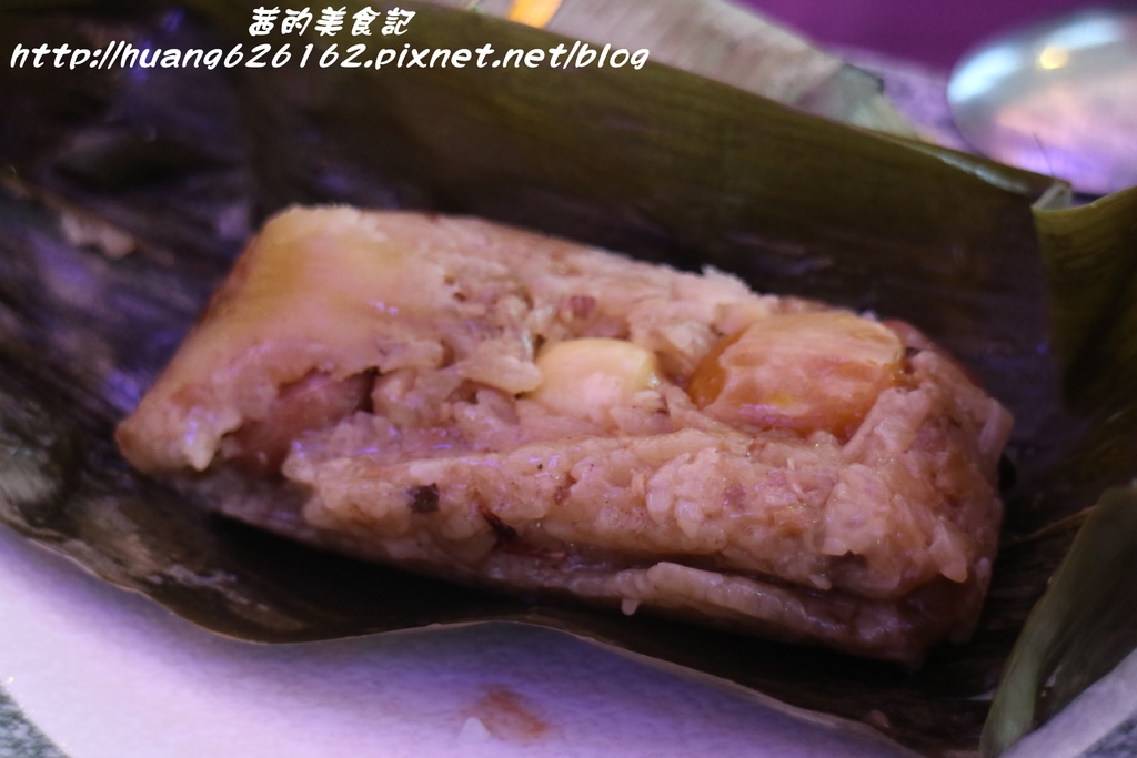 干貝竹葉粽外型為長條形,糯米吃起來雖然有點偏軟爛,但吃起來有鹹蛋黃與蓮子、 花生的香氣,我喜歡~![]()