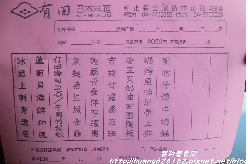 有田日本料理就開在鹿港麥當勞斜對面,會來吃這家餐廳完全是因為 之前常去吃的正港海鮮料理歇業,初二婆婆要請女婿吃飯,就特別選這家住家步行不用5分鐘,交通便利,有田日本料理共有二層樓,座位大都是大圓桌居多,還有幾間獨立包廂,一樓裝潢看起來相當氣派, 當天是年初三中午整間呈現客滿狀態,這是我離去時才拍一樓用餐空間~