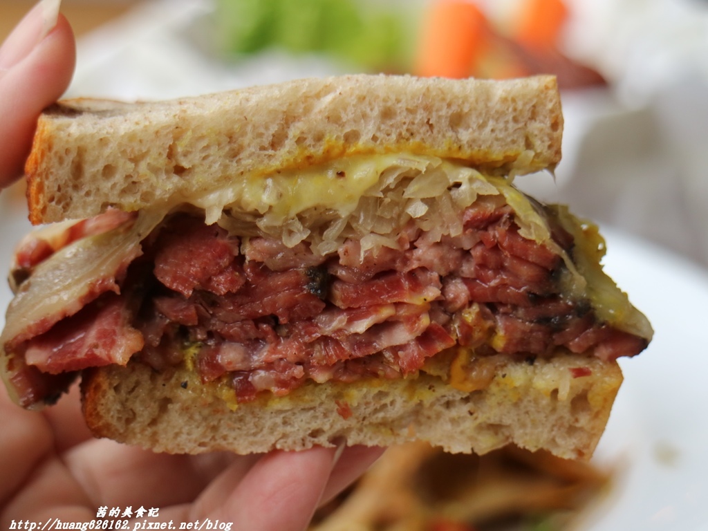 啪啪牛肉三明治使用牛胸腹肉,以天然海鹽混合多種辛香料醃製,裸麥麵包內夾著酸菜、瑞士起司及美式黃芥末醬,並附上薯條看起來好膨湃了![]()