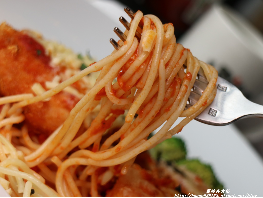 帕瑪森嬤嬤雞肉排番茄細麵 使用低脂雞胸肉包裹帕瑪森起士,義大利麵上面淋上自製義式香蒜蕃茄醬![]()