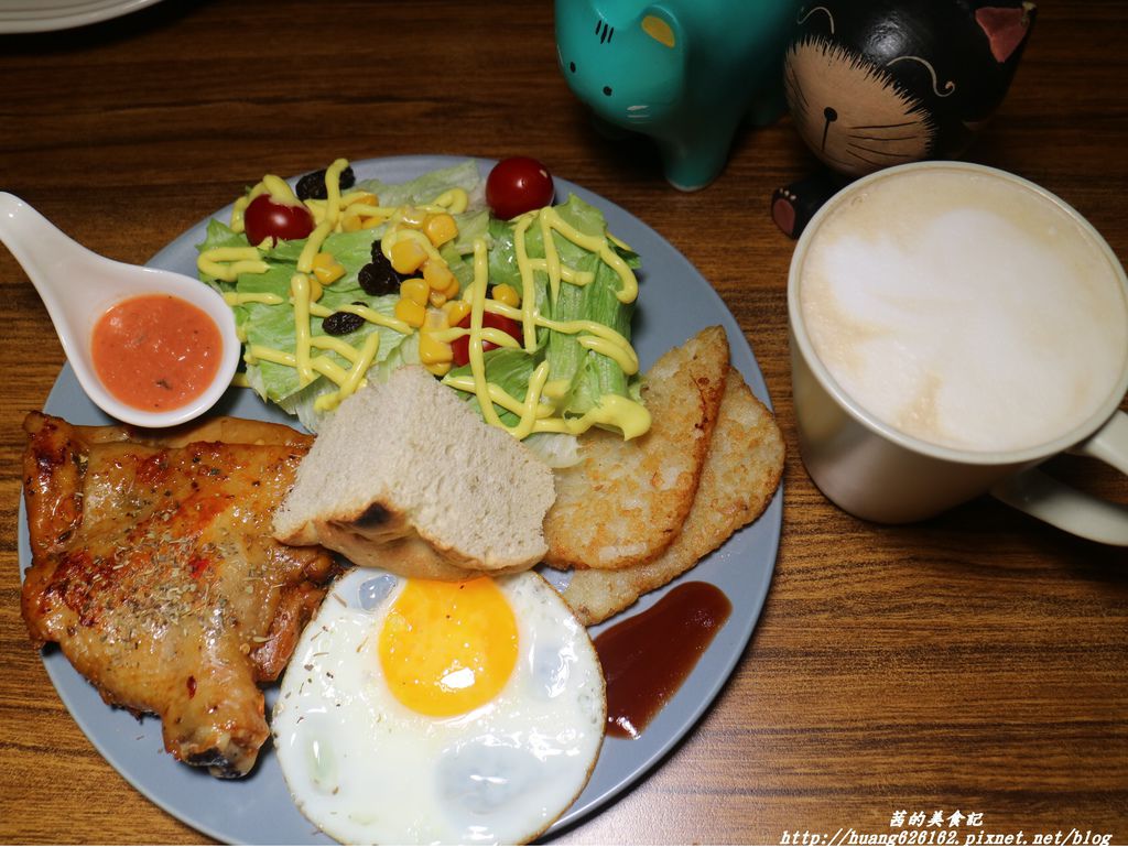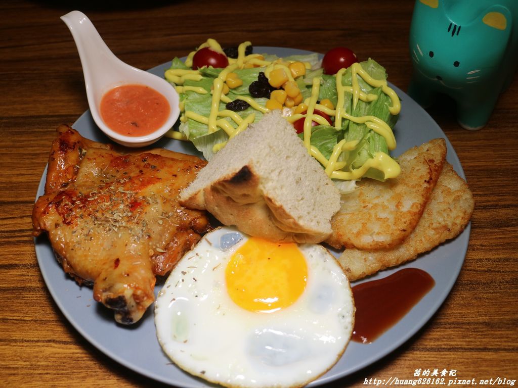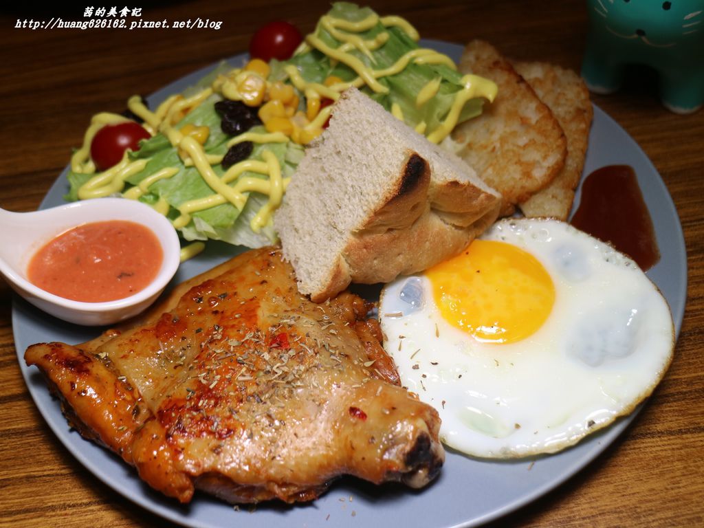 迷迭香雞腿套餐內含:迷迭香雞腿排、太陽蛋、薯餅、佛卡夏麵包、蜂蜜芥末沙拉,非常豐盛